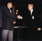 Elegant Machinery are soon back with a new single and a compilation album. Here singer Robert Enforsen receives their Swedish Electronic Music Award for best live act 1997 out of Alexander Hofman's hand in Gothenburg earlier this year.